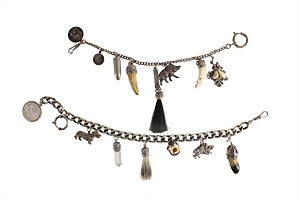 lot: 2 Charivari pocket watch chains, 1 chain, silver 835/000, signed BS, with sundry pendants: Austrian coin, 1 dachshund, 1 rock crystal, 1 tufts of hair, jointed set of teeth, 1 boars and 1 claw, total 147,5 g, 1 Charivari chain with sundry silver pendants, among others 1 cartridge various teeth, stag teeth and others, total 78.0 g