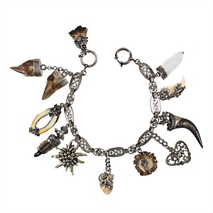 very unusual Charivari fob watch chain, silver (tested), 12 different pendants with sundry claws, claws and teeth, 1 edelweiss (silver), 1 horse in a heart, 1 rock crystal, length = 23.0 cm, total 157.3 g