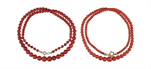 lot: 2 graduatedcoral necklaces, 1 necklace, diameter = 3.3 - 8.1 mm, length = 46.5 cm, 1 necklace diameter = 4.0 - 8.3 mm, length = 46.5 cm, total 31.2 g, for this item is shipping to countries outside of the EU not possible!