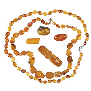 lot: amber/BUTTERSCOTCH, 2 brooches (metal), 1 brooch silver c. 38.2 x 27.0 mm, 1 bracelet (elastic band), width = 19.0 mm, diameter = c. 55 mm, 1 necklace, length = c. 56.0 cm, 1 necklace, olives, diameter = 8.0 - 12.5 mm, length = 76.5 cm, total 153.0 g