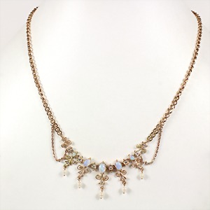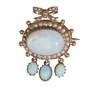 Brosche, VICTORIAN 1870/80, GG 333/000, zentraler Opal in vorwiegend grünen- u. blauen Farbtönen, ca. 5,5 ct (14,7 x 10,4 mm), im Kranz 25 Stck. 1/2 Perlen, Gader umlaufend durchbrochen gearbeitet, kl. Zierkugeln, 3 abgehängte Opale, H = 31,6 mm, den Abschluss bildet eine feine mit Perlen ausgefasste Schleife