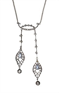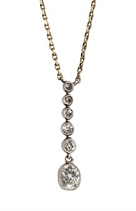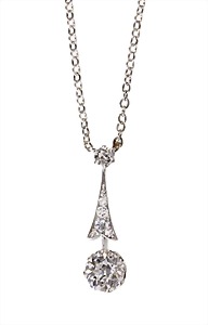 necklace around 1910, platinum/white gold ? 1 hanging old cut-diamond c. 0.65 ct white (diameter = 5.4 mm, high cut), 3 additional diamonds c. 0.11 ct white, front: height = 21.2 mm, length = c. 39.0 cm