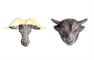 Lot: 1 Paar Broschen ART-DECO 1930/40er Jahre, 1 Brosche, Silber (STERLING), Büffelkopf mit Hörnern (Bein), farbloser Strass ca. 40,3 x 27,4 mm; 1 Stierkopf mit roten Steinaugen, Silber (geprüft), plastisch ausgearbeitet, ca. 34,8 x 26,5 mm