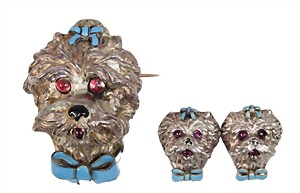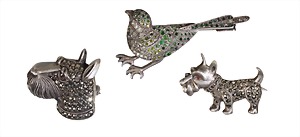 lot: silver jewelry, ART-DECO 1930/'40s, silver 835/000 and 935/000, paved with markasites and glass stones, 3 brooches, 1 dog, 1 dog head and 1 bird (hallmark isn't interpretable), length = 27.0 mm - 50.0 mm, some stones must be replaced!