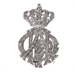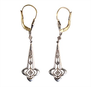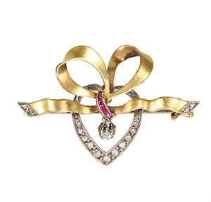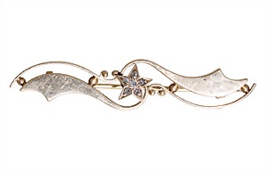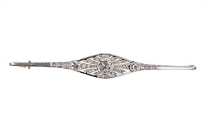 Brosche, ART-DEKO 1930/40er Jahre, GG 750/000, signiert, zentraler Altschliff-Diamanten ca. 0,80 ct tw/w-vsi, sehr hoch geschliffen (schöne Brillanz), seitlich 2 weitere Altschliff-Diamanten ca. 0,32 ct tw/w-vsi, Mittelteil ausgefasst mit 26 Diamantrosen (Diamanten in Platin gefasst), L = 73,1 mm