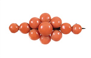 Korallenbrosche um 1880/90, Tombak ?, 11 Korallenboutons, mittlere Koralle ca. 8,0 mm, L = ca. 40,3 mm, Versand nur innerhalb der EU !