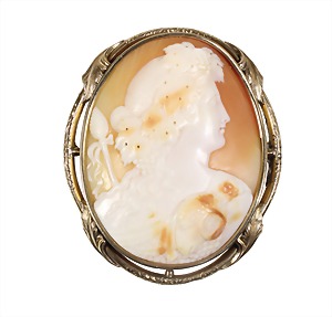 Brosche, VIKTORIANISCH um 1870/80, GG 585/000, fein geschnittene Muschelgemme, Frauenbüste, Ansicht von schräg hinten, ein Kranz aus Weinlaub u. Traubenhenkel im Haar, auf der Schulter ein Schafskopf, auf Luft gesetzter Zierrahmen, ca. 50,0 x 59,2 mm, total 22,9 g