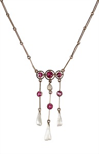 Collier, JUGENDSTIL um 1900, GG 333/000, Mittelteil mit rubinfarbenen facettierten Steinen besetzt, 3 an Messerdrähten abgehängte Flügelperlen, vorne H = 45,0 mm, zarte Drahtgliederkette, L = 46,5 cm (Federring wohl später !)