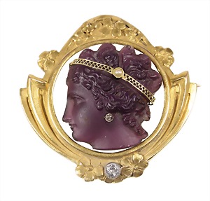 brooch, art nouveau, France around 1900, yellow gold 585/000 (tested), fire-gilded, unsigned, engraved woman's head cut into an amethyst (down below tiny chips), with matted rock crystal inlaid, a fine gold ribbon embraces the hair, 1 old cut-diamond c. 0.16 ct, all round decor with fine formed flowers, brooch: c. 44.5 x 43.2 mm, total 26.4 g, nice condition !