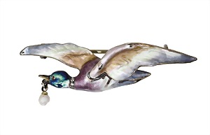Brosche, JUGENDSTIL um 1900, ENTE, Silber 900/000 (DEPOSE), sig., MEYLE & MAYER (Pforzheim), transluziedes Emaille, Körper plastisch ausgearbeitet, Halsband mit Steinen besetzt, kl. abgehängte Naturperle im Schnabel, (Emaille mit Fehlstellen), L = 53,5 mm