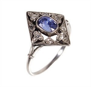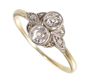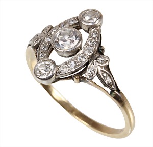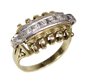 ring, ART-DECO 1930/'40s, white gold 585/000, 1 diamond/brilliant c. 0.13 ct white, outside in the wreath 8 pieces 8/8 cut diamonds white, ring head c. 8.8 x 14.8 mm, ring width c. 55