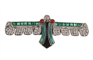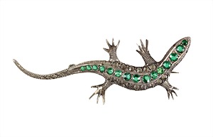 Brosche, SALAMANDER, ART-DECO 1920/30er Jahre, Silber 835/000, längs über den Rücken grüne u. farblose Glassteine (facettiert), L = 73,5 mm