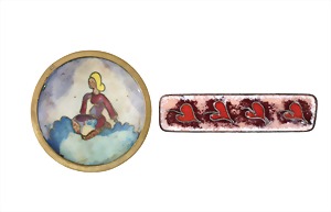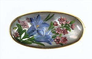 brooch 1920/'30s IDAR-OBERSTEIN, yellow gold 585/000, rock crystal engraved from back (intaglio) with fine hair painting, in foreground two gentians, rose flowers in the background, c. 17.3 x 33.5 mm, very good condition !