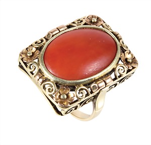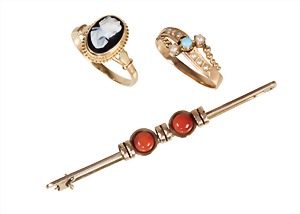 jewelry lot around 1880/1920, yellow gold 585/000, 1 ring set with turquoise and 1/2 pearls, ring width c. 53, 1 ring with agate gem, portrait of a woman to the right, ring width c. 55, both France, rose gold 750/000, 1 pin rose gold 333/000, set with 2 coral buttons, lenght = 59.0 mm, total 6.9 g, this item can't be shipped to countries outside the EU!