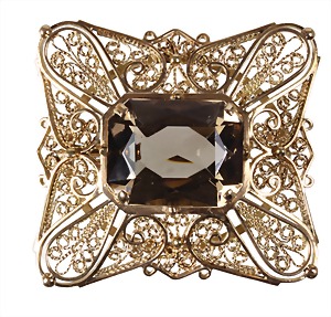 Brosche, JUGENDSTIL, Frankreich um 1900, GG 585/000 (geprüft), feuervergoldet, unsig., gravierter Frauenkopf in Amethyst geschnitten (unten winzige Chips), mit mattiertem Bergkristall hinterlegt, ein feines Goldband umspannt die Haare, 1 Altschliff-Diamant ca. 0,16 ct, im umlaufendem Dekor fein ausgearbeitete Blüten, Brosche: ca. 44,5 x 43,2 mm, total 26,4 g, schöner Zustand !