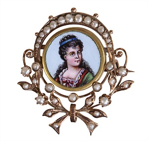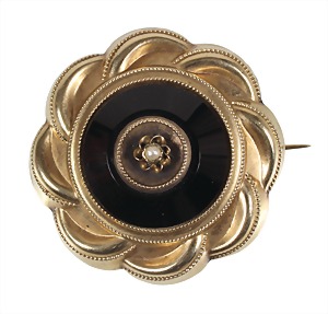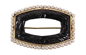 brooch, ART-DECO 1930/'40s, yellow gold 585/000, onyx on both sides engraved (slightly curved), all round wreath made of natural pearls, underbody with ornament at the side, c. 30.6 x 21.5 mm, nice condition !
