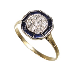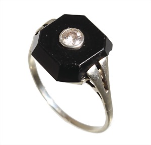 Ring, ART-DECO 1930/40er Jahre, WG 585/000, 1 Diamant/Brillant ca. 0,13 ct weiß, außen im Kranz 8 Stck. 8/8-kant Diamanten weiß, Ringkopf ca. 8,8 x 14,8 mm, RW ca. 55
