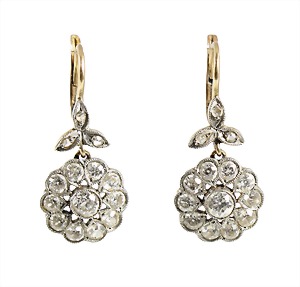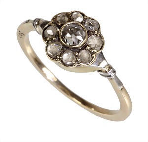 Ring, Anfang 20.Jhd, GG 585/000, 1 Altschliff-Diamant ca. 0,15 ct weiß, im Kranz 8 Diamantrosen weiß, Ringkopf ca. D = 8,0 mm, RW ca. 51,5