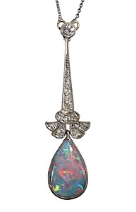Feines Collier, ART-DECO 1920/30er Jahre, PLATIN (geprüft), an Messerdrähten abgehängter Opal ca. 1,2 ct, darüber 4 Altschliff-Diamanten ca. 0,68 ct weiß, Opal in intensiv roten Farbtönen (mit etwas grün/gelb u. blau), Abhängung H = 41,0 mm, L = 49,5 cm (am Sicherheitskettchen fehlt der Federring!)