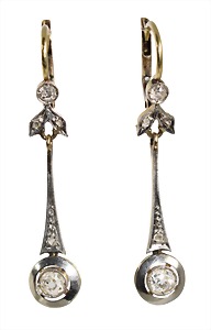 Collier um 1910, Platin/WG ? 1 abgehängter Altschliff-Diamant ca. 0,65 ct weiß (D = 5,4 mm, hoch geschliffen), 3 weitere Diamanten ca. 0.11 ct weiß, vorne: H = 21,2 mm, L = ca. 39,0 cm