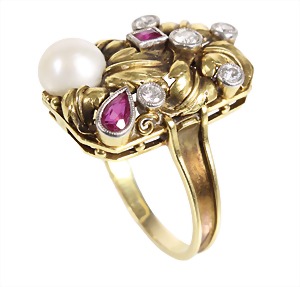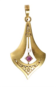 Anhänger, JUGENDSTIL um 1900,GG 585/000, kl. rubinfarbener Stein (fac.), kl. Perle, zarte florale Ornamente, H = 40,5 mm