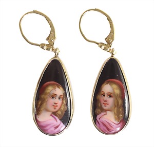 a pair of ear pendants late 20th century, yellow gold 333/000, painting on porcelain, portrait of a young lady, (reproduced in mirror image), drop shaped pendant earrings, height = 40.4 mm