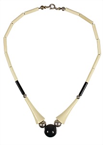 necklace, ART-DECO the 1930s, BENGEL Idar-Oberstein, white metal, black and ivory-colored galalith, graphic designed necklace, back worked with little tubular sticks, length = c. 42.0 cm