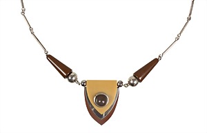 Collier, ART-DECO der 1930er Jahre, BENGEL Idar-Oberstein, weißes Metall, in braunen Farbtönen gehaltenes Galalith, vorne H = 37,2 mm, graphisch gestaltete Kette, nach hinten mit Röhren-Stäbchen gearbeitet, L = ca. 46,5 cm
