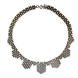 Collier, BENGEL (Idar-Oberstein) 1930-33er Jahre, weißes Metall, Ziegelstein/Backstein Muster, vorne H = 27,5 mm, L = ca. 39,5 cm, Lit. Museumskatalog S. 92 u. 93 (ähnl.)