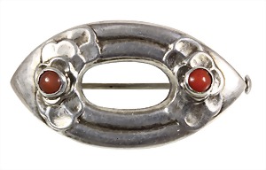 brooch, art nouveau around 1905, GEORG JENSEN, silver 925/000, signed STERLING DENMARK 925 N° 34, 2 small coral buttons, textured flowers, in the middle pierced worked, c. 37.3 x 20.3 mm, for this item is shipping to countries outside of the EU not possible!