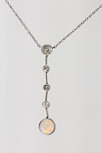 fine necklace, ART-DECO 1920/'30s, platinum (tested), opal hanging on knife wires c. 1,2 ct, above it 4 old cut diamonds c. 0.68 ct white, opal with intense red color shades (with a bit green/yellow and blue), height of the hanging part = 41.0 mm, length = 49.5 cm (spring-ring at the safety chain is missing!)