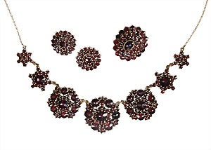 lot: garnet jewelry, yellow gold 585/000 (tested), ring with central rose-cut granate surrounded from 3 garnet wreaths, ring head c. 20.5 x 23.5 mm, ring width c. 55/56, ear clips (Omega mechanism), diameter = 17.0 mm, necklace with 7 garnet elements, front: diameter = c. 25.0 mm, length = 43.0 cm, total 43.3 g