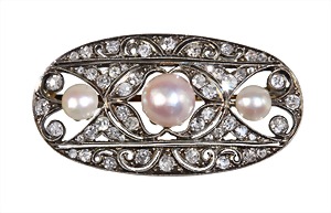 Brosche, ART-DECO 1920/30er Jahre, Silber, Nadel u. Perlschalen in Gold, 3 Perlen D = 7,8, 5,4 u. 5,2 mm (Naturperlen ?), 40 Diamanten ca. 0,80 ct weiß, 12 Diamantrosen weiß, Brosche fein durchbrochen gearbeitet , Millgriffverzierung, ca. 40,0 x 21,4 mm