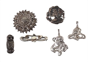 Lot Silberschmuck: JUGENDSTIL/ART-DECO, 1900-1940er Jahre, 2 Anhänger; 4 Broschen, teilw. mit Markasiten besetzt, (1 Opalbrosche später !)