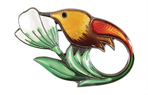 Brosche, stilisierter VOGEL auf einer Blüte, DAVID ANDERSON, Silber 925/000 verg., sig. DAVID-ANDERSEN, farbenfrohes Emaille, ca. 56,5 x 36,2 mm