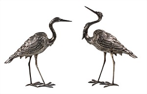 1 Paar KRANICHE, Silber (gep.), Signatur nicht zu deuten, vollplastisch ausgearbeitet, relieffierte Oberfläche, H = 17,0 cm, total ca. 135,0 g