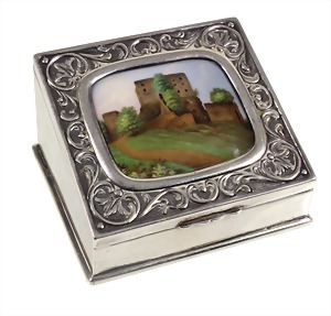 Briefmarkenschatulle mit 2 Fächern, 1.Hälfte 20.Jhd., Silber 800, sig., relieffierter Deckel mit bemalter Plakette, ca. 67,0 x 57,0 mm, H = 37,2 mm, total 111,0 g, schöner Zustand
