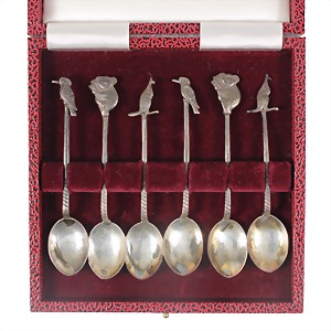 6 Mocca-Löffel, Silber 800/000, sig. W.J.S., verschiedene Tiermotive: Känguru, Koalabär u. Eisvogel, L = ca.94,0 mm, Originalschatulle !