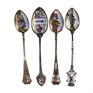 4 Andenken Löffel, Silber 800/000, 1 x BERLIN, Brandenburger Tor; 1 x NÜRNBERG, Burg, Gänsemännchen u. Dürerhaus; 1 x Bad SALZSCHLIERF, Bonifaziusbrunnen; 1 x Kurhaus (Inschrift fehlt)