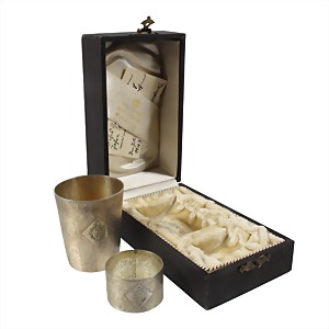 mug and napkin ring by Luc. LORTZ HOFJUWELIER WÜRZBURG, silver 800/000, signed, ear (symbol), mug with the initials: CF, height = 65.0 mm, diameter =54.0 mm, napkin ring, diameter = 40.0 mm, a gift (1894) by: Helene Freifrau von Geyer née Thoma via Fred Goedecke to the nephew Joachim, total 83.3 g, with original casket and calling card by the Freifrau von Geyer with the handover from 1943