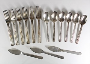 cutlery with 15 pieces, CHRISTOFFLE (MIRA LUC LANEL), ART-DECO 1930-'40s, silver-plated, signed CHRISTOFFLE, 6 forks, 3 knives (fish cutlery) and 6 spoons, length = 17.3 - 20.7 cm