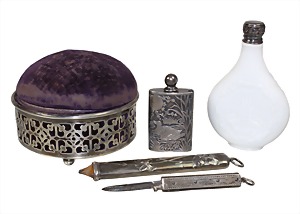 Lot: diverse Silber Utensilien, 1 kl. Taschenmesser, England, Birmingham Mitte 19.Jhd, sig. J.H. Anker/Löwe, L = 81,3 mm; 1 Nadelkissen auf 3 Füßen, Sterling, D = ca. 7,7 cm; 1 Schiebebleistift, Frankreich JUGENDSTIL um 1900; 1 Streichholzflacon mit Asiatischen Vogelmotiven ca. 28,0 x 47,0 mm ; 1 Flacon mit Schraubdeckel für KOELNISCH WASSER mit Abbildung des Kölner Doms, H = ca. 78,5 mm