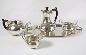 4-teilig. Service: Birmingham 1920, 925/000 (Sterlingsilber), Kaffeekanne, H = 19,5, D =14,0 cm, Teekanne, H = 11,0 cm (beide mit schwarzen Griffen), Milchkännchen sowie Zuckergefäß, total 1,32 kg, dazu 1 Tablett, sig. JT & Co LDS EPNS (elektroplated) ca.45,0 x 29,0 cm (total 0,93 kg