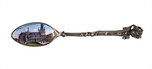 Mocca Löffel, Wien um 1900, Silber, sig., G.A.S. (Anton Scheid), Emaillebild: LIEGE CATHEDRALE, reich verzierter Stil mit Mädchenkopf am Ende, L = 10,4 cm