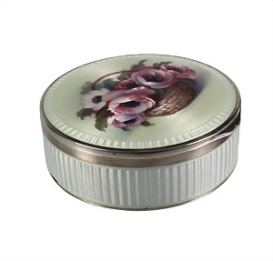 small box probably Pforzheim, silver 935/000, signed, flower bouquet in a basket, translucent enamel in delicate green and rose color shades, gouilloched, hinged lid, diameter = 57.7 mm, height = 21.0 mm