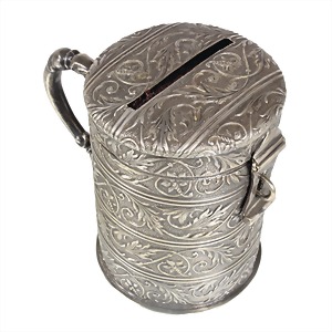 Spardose mit Henkel um 1900, Silber (geprüft), umlaufend floral ornamentiert, D = 60,0 mm, H = 85,7 mm, total 136 g