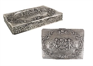 Schatulle, Hanau Anfang 20.Jhd, Silber, im Deckel 4 Puttis um einen Korb mit überquellenden Blüten, Szene relieffiert ausgearbeitet, umlaufender Fries aus Blüten, Körben u. stilisiertem Blattwerk, ca. 15,8 x 11,3 x 30,0 mm, total 392,2 g