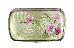 Feines Damen Zigarettenetui, Pforzheim um 1900, Silber 935/000, innen verg., sig., BC, grazile Nelken vor zart grünem Hintergrund, transluziedes Emaille, spiralförmig gouillochiert, Scharnierdeckel, Maße: ca. 80,0 x 46,0 x 12,8 mm, formschöner Handschmeichler !