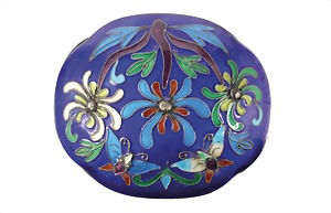 Deckeldose, China 1950er Jahre, innen und außen cobaltblau emailliert, Deckel mit stilisierten Chrysanthemen farbenfroh eingebunden, von unten Blüten- und Blätterfries, oval: ca. 63,0 x 54,0 mm, H = 27,0 mm