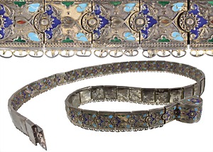 belt, Russia around 1900, silver 84 Zolotniki, 50 colored enameled elements plus arched lock (slied on a leather belt), width = 24.0 mm, length = 97.0 cm, total c. 462 g